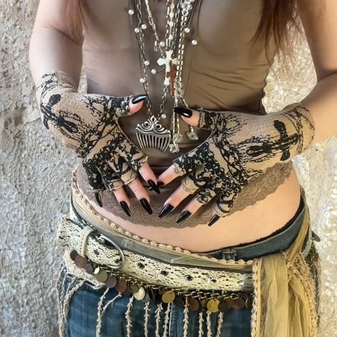 tan fingerless gloves with black screen printed graphic on outside only