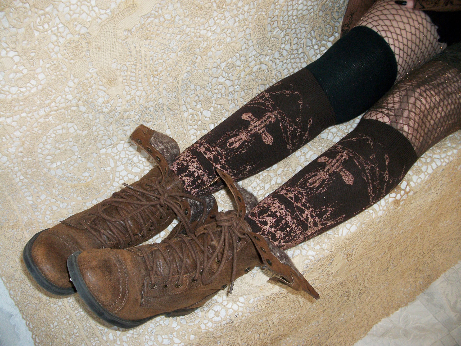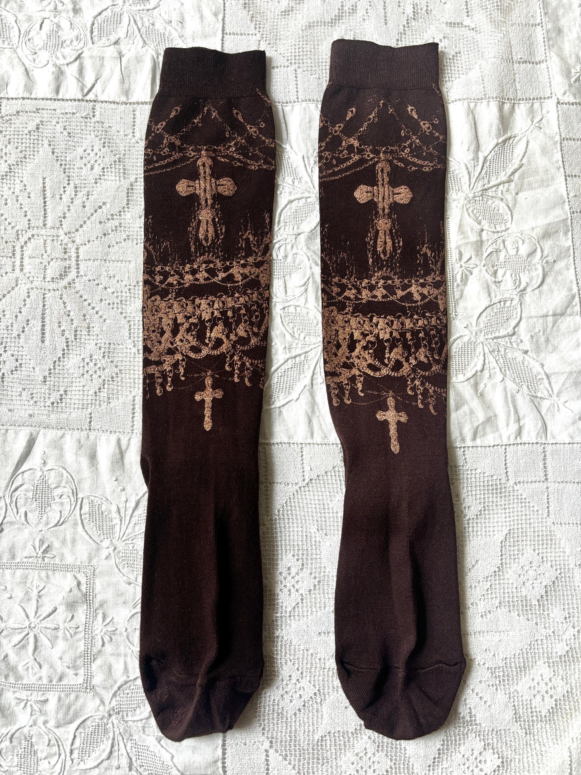 chocolate brown knee high socks with copper worshiped graphics on front and back