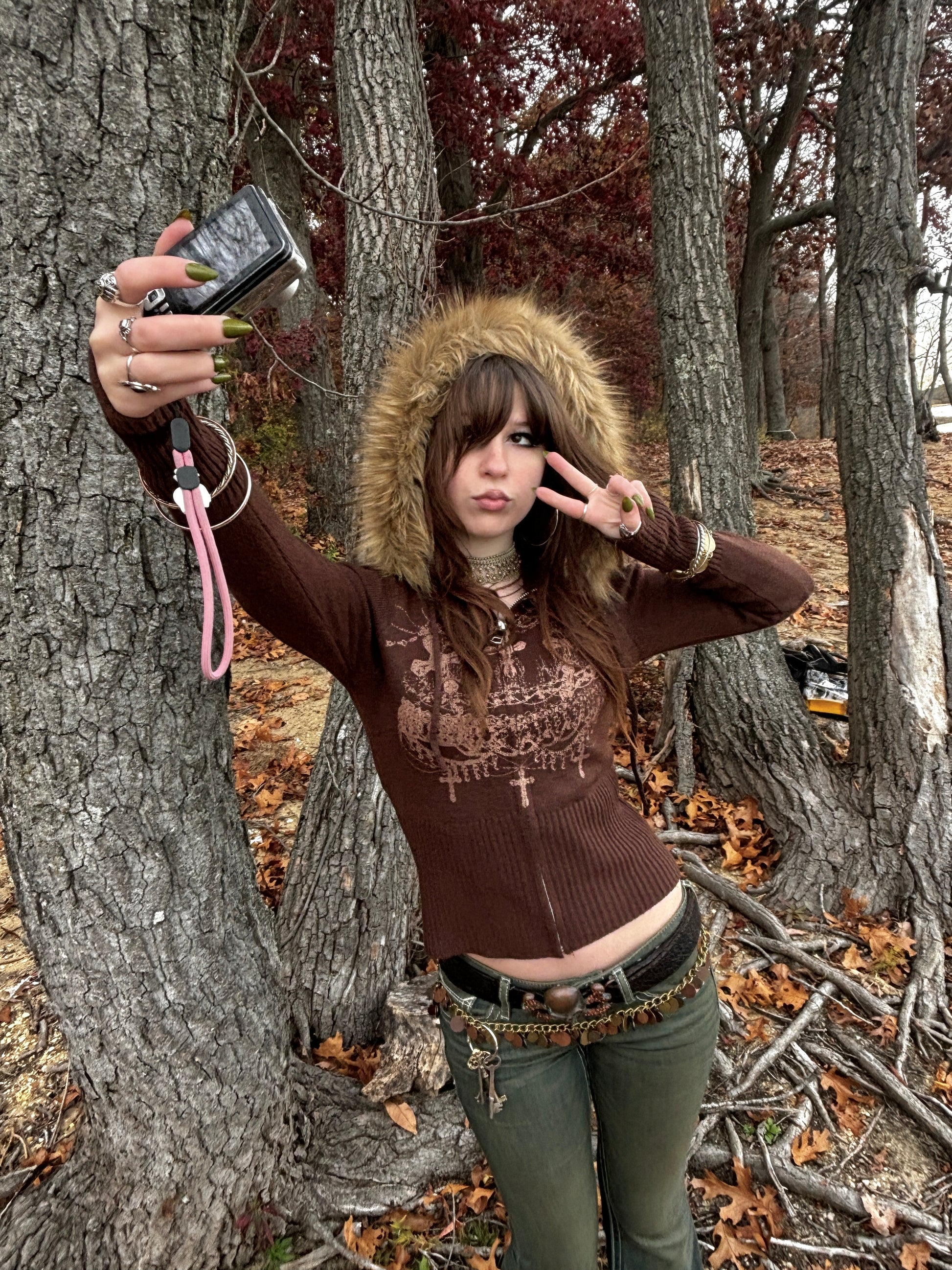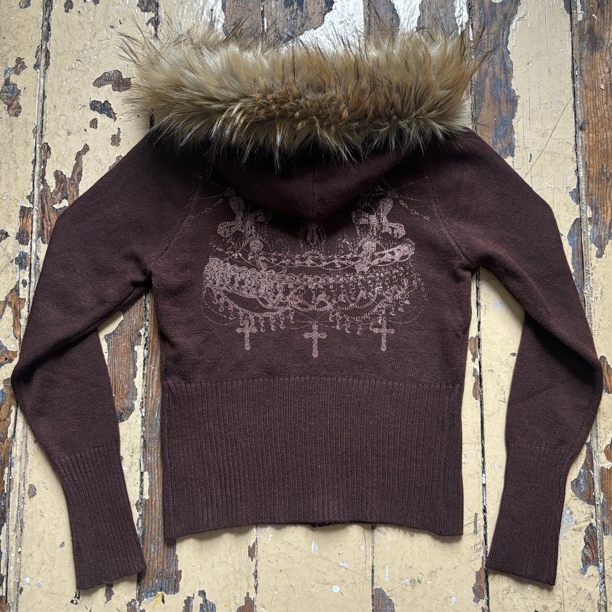 chocolate brown stretch knit snatched zip up sweater hoodie with faux fur trim hood and copper graphics